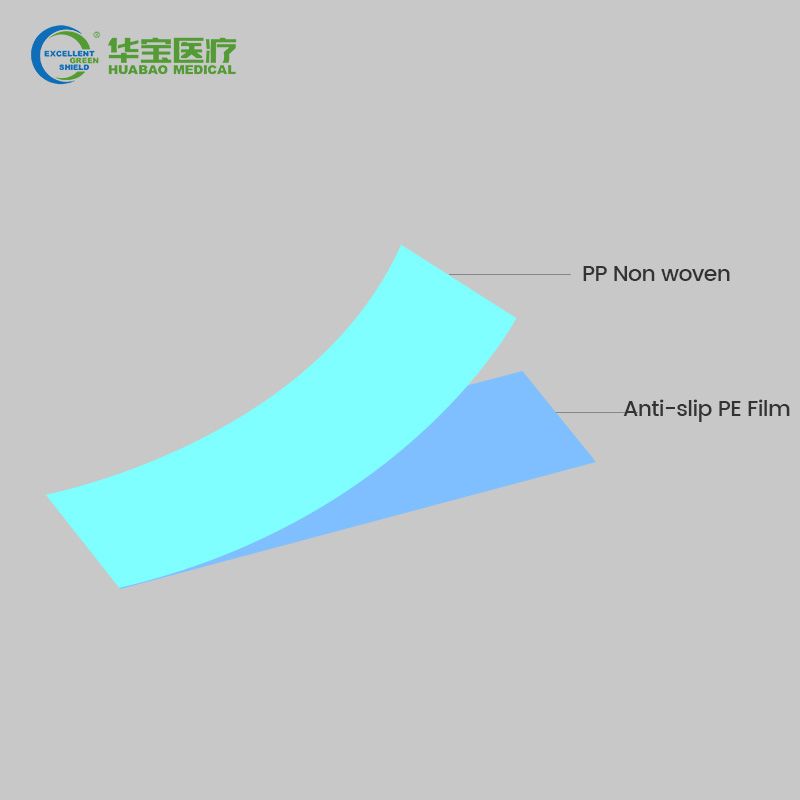 PE film added with anti-skid particles is compounded with non-woven fabric to increase the anti-skid coefficient and increase the friction. It is commonly used in anti-skid shoe covers and boot covers.